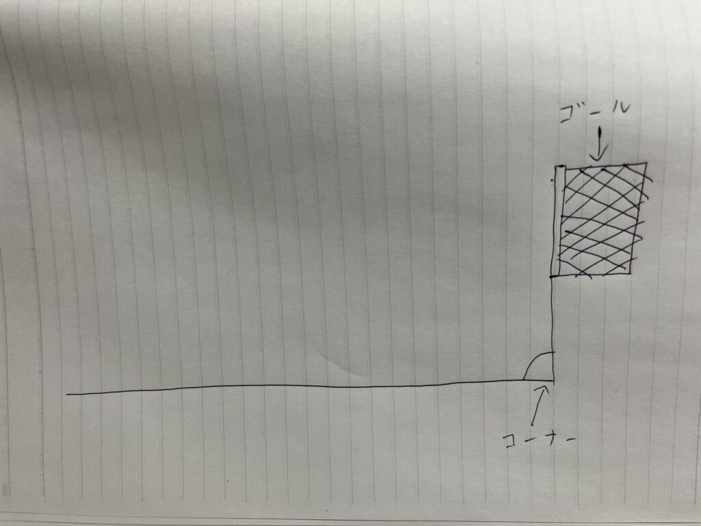 コーナーキックを蹴る位置はゴールライン上にあります。つまり、ゴールの真横から蹴ることになるのです。